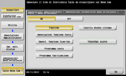 Toccare [ON] e selezionare una funzione da associare a un tasto scorciatoia, quindi toccare [OK].