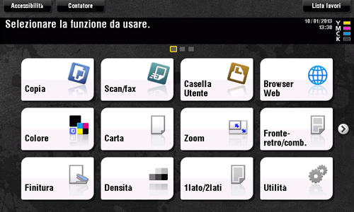 Il menu principale può essere visualizzato su tre schermate se necessario. Il menu può contenere fino a 12 tasti scorciatoia per ogni schermata e 25 tasti scorciatoia su tre schermate. [Utilità] è visualizzato fisso sul lato inferiore destro della prima pagina.