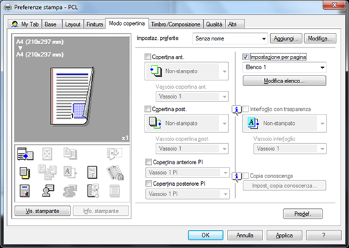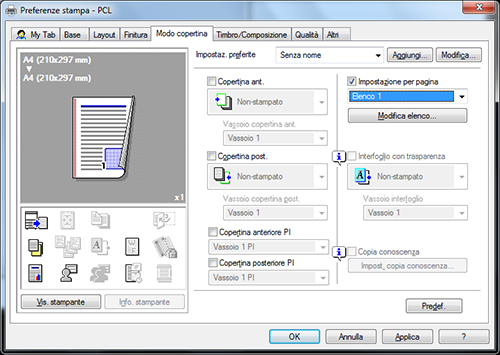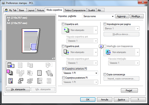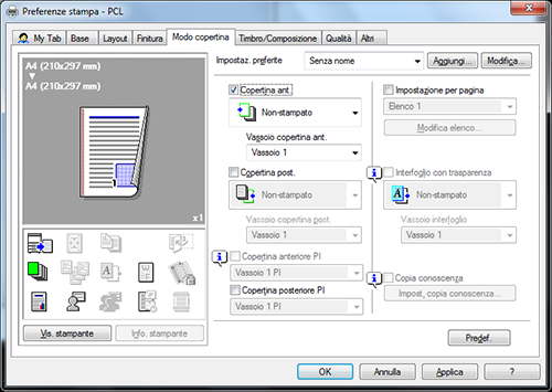 Per stampare una copertina su un tipo di carta diverso, selezionare la casella di controllo [Copertina ant.] sulla scheda [Modo copertina].
