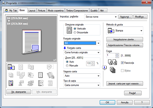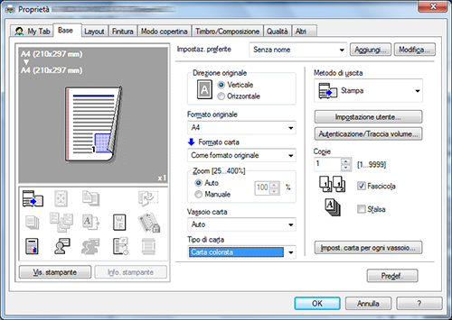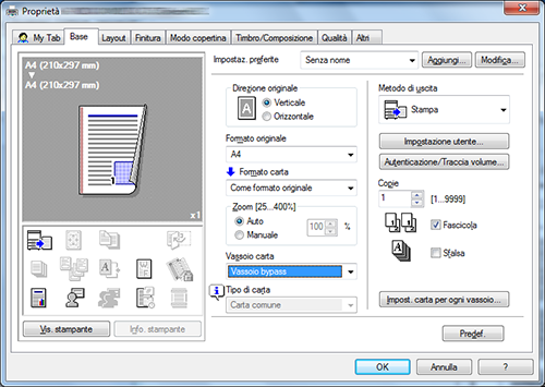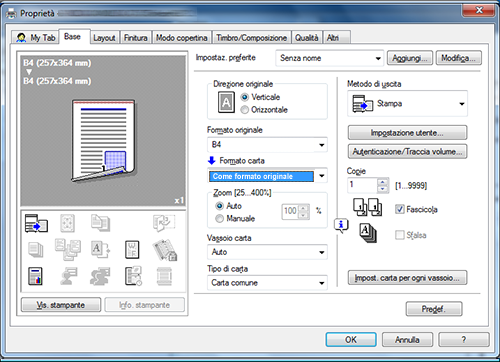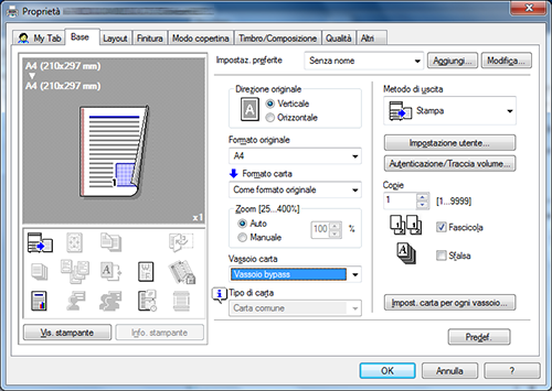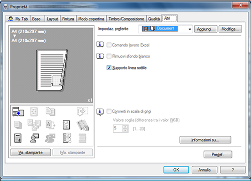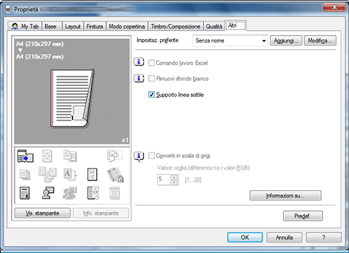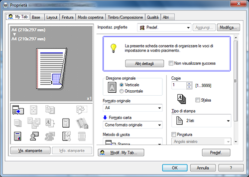 A15. Sì. La finestra può essere personalizzata facilmente dalla finestra delle proprietà del driver di stampa, registrando le funzioni utilizzate di frequente collettivamente da My Tab (La mia scheda), oppure registrando le impostazioni delle rispettive schede come preferite per l'attivazione rapida.