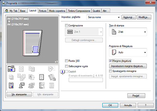 Per configurare il margine pagina, selezionare la casella di controllo [Margine rilegatura] sulla scheda [Layout] quindi fare clic su [Impostazioni margine rilegatura].
