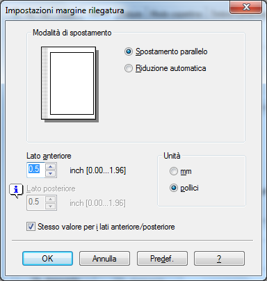 [Lato anteriore]/[Lato posteriore] | Inserire la larghezza del margine pagina. Nella stampa su 2 lati, deselezionando la casella di controllo [Stesso valore per i lati anteriore/posteriore] è possibile impostare dei valori diversi per i lati anteriore e posteriore. |