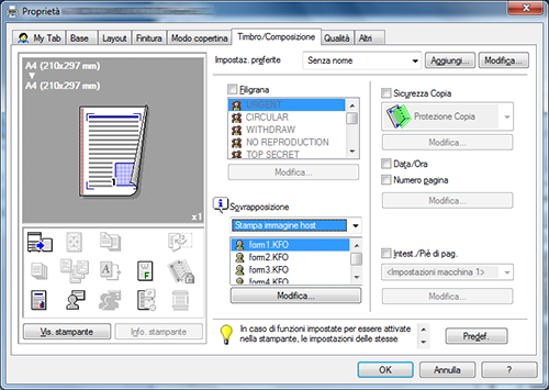 Per stampare un documento sopra al prodotto di un file creato su un computer, selezionare [Stampa immagine host] da [Sovrapposizione] sulla scheda [Timbro/Composizione], quindi selezionare il file della stampa in sovrapposizione.