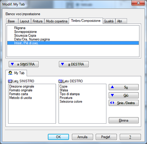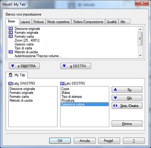 Per riorganizzare le funzioni registrate su My Tab, selezionare la funzione che si desidera ricollocare su [My Tab], quindi fare clic su [Su], [Giù], oppure [Sinis./Destra].
