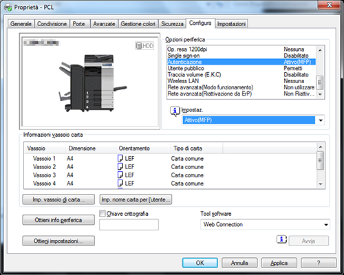 R2. Nella finestra Proprietà del driver di stampa, modificare l'autenticazione utente nell'impostazione corretta.