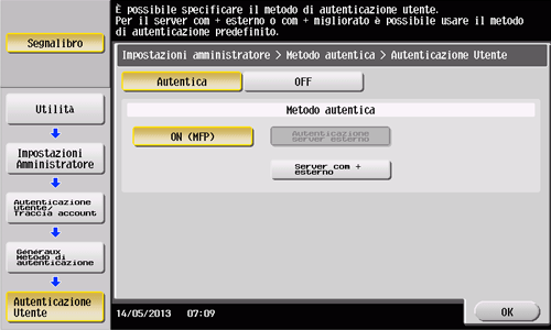 Lo stato di autenticazione può essere: [ON (MFP)], [Autenticazione server esterno], [Server com + esterno], [Autentic. server avanzata] oppure [Server com + migliorato]. Per informazioni sull'autenticazione utente basata su server, contattare l'amministratore del server.