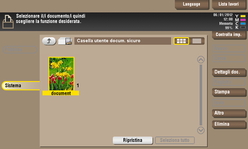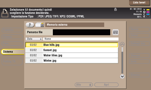 Selezionare una cartella, quindi premere [Apri] per elencare i documenti e le cartelle contenuti nella cartella prescelta. Premere [Alto] per tornare alla posizione superiore di un livello.
