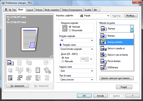 In [Metodo di uscita] sulla scheda [Base], selezionare [Stampa protetta].