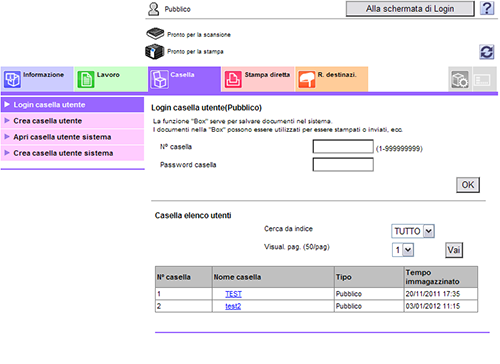 Premere [Casella Utente], selezionare una casella utente e premere [Apri].