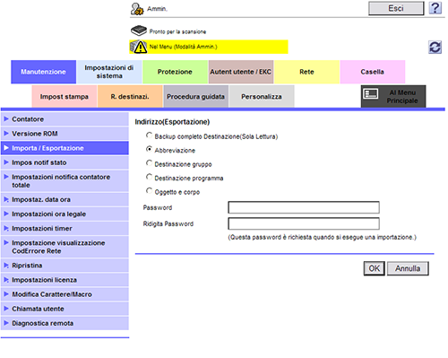 Una volta eseguita l'esportazione con l'inserimento della password, l'importazione delle destinazioni in un altro MFP richiederà di inserire la password.