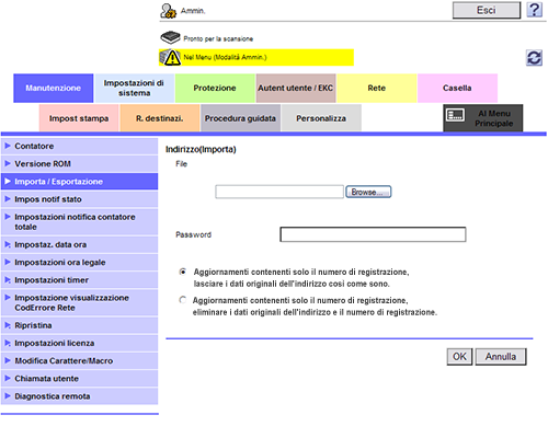 Quando si importa il file [Indirizzo], se si seleziona [Aggiornamenti contenenti solo il numero di registrazione, lasciare i dati originali dell'indirizzo cosi come sono.], le informazioni dell'indirizzo nel file da importare, che contiene unicamente un numero di registrazione, non verranno registrate nella macchina. Se si seleziona [Aggiornamenti contenenti solo il numero di registrazione, eliminare i dati originali dell'indirizzo e il numero di registrazione. ], le informazioni dell'indirizzo contenenti unicamente un numero di registrazione verranno eliminate dalla macchina.