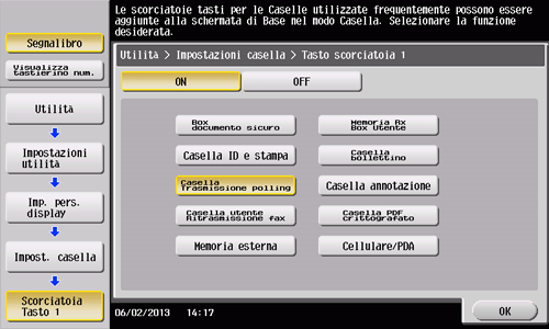 Selezionare [ON] e le impostazioni da visualizzare come tasto scorciatoia, quindi premere [OK].