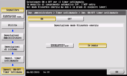 Selezionare [ON], selezionare [Spegnimento automatico ErP] oppure [In pausa], quindi premere [OK].