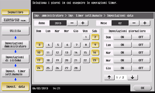 Selezionare [Impostazioni di sistema] - [Impost. timer settimanale] - [Impost. ON/OFF Timer Settimana].