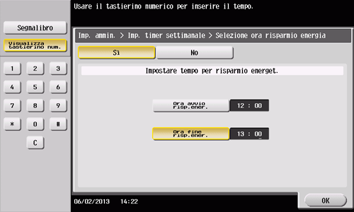 Premere [Sì], utilizzando la Tastiera, inserire l'intervallo di tempo in cui attivare il modo risparmio energia, quindi premere [OK].