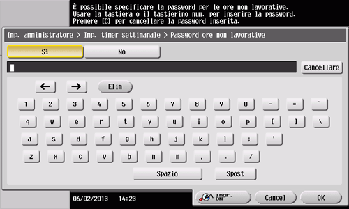 [Password ore non lavorative] | Utilizzando il timer settimanale si limita l'utilizzo della macchina, quando è attivo il modo Risparmio energia, tramite una password. |