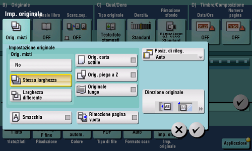 Anche per un originale con pagine di diversi formati, utilizzando l'ADF è possibile scansionare i dati mentre si rileva il formato di ogni pagina. Se le larghezze degli originali sono identiche, selezionare [Stessa larghezza]. Se le larghezze degli originali sono differenti, selezionare [Larghezza differente].