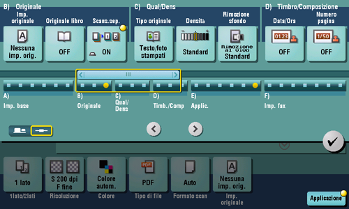 [Matrice a punti origin] | Premere questo tasto per scansionare un originale costituito principalmente da testo con carta sottile o debole, secondo un livello ottimale di qualità immagine. Scurire il testo per migliorarne la leggibilità. |