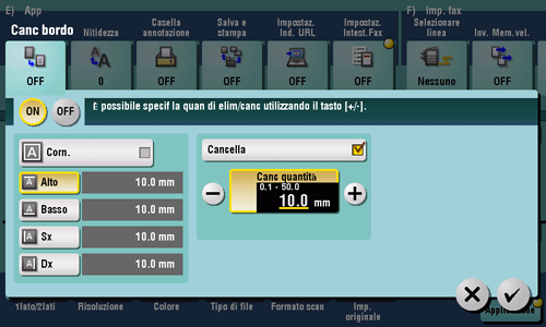 [ON]/[OFF] | Selezionare [ON] per specificare Canc bordo. |
