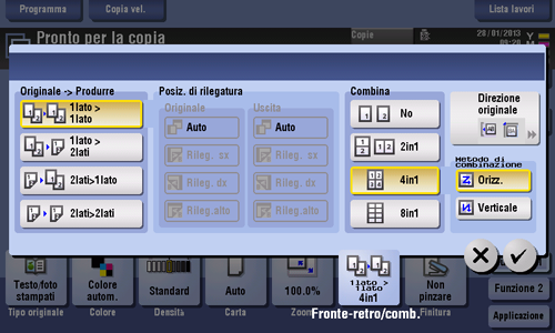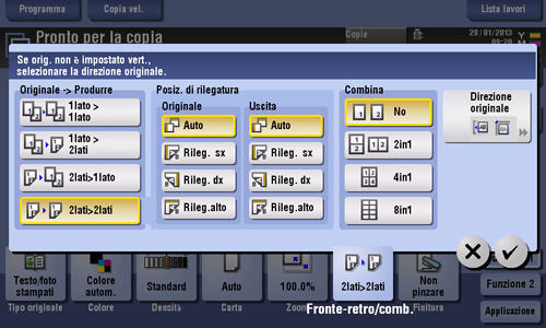 [Posizione di rilegatura] | Selezionare le posizioni di rilegatura dell'originale e della copia. | |