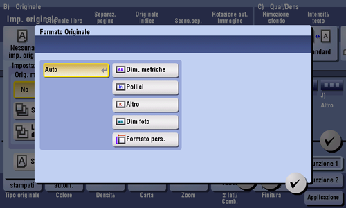 Se il formato dell'originale non viene rilevato correttamente, selezionare un tasto indicante il formato dell'originale da scansionare. Se la macchina non rileva il formato di originali o foto dal formato irregolare, specificare manualmente il formato.