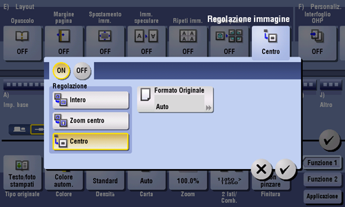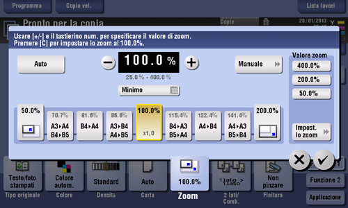 Zoom fisso | Selezionare uno zoom predefinito quando si copia da un originale con formato standard su di un foglio di carta di formato standard. Il vassoio carta è selezionato automaticamente in base al valore di zoom selezionato. |