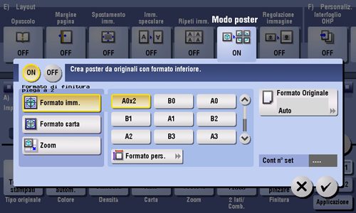 [Cont n⁰ set] | Quando si seleziona una voce diversa da [Auto] in [Formato Originale], viene visualizzato il numero di fogli da produrre. |