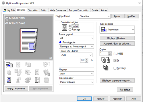 Pour savoir comment afficher la fenêtre [Options d'impression], voir [Comment afficher la page Préférences d'impression] .