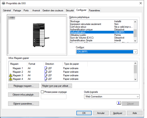 Lorsque vous utilisez cette machine pour la première fois, vérifiez les informations comme quelles sont les options installées sur cette machine et si les réglages d'authentification qui ont été configurés sont correctement reflétés dans le pilote d'imprimante.