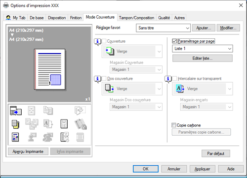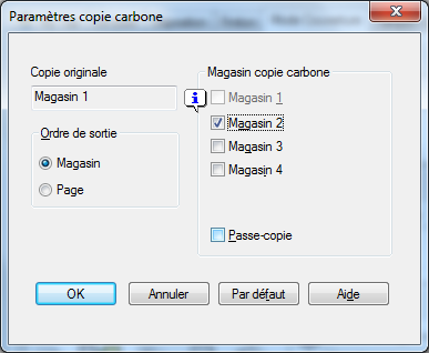 [Magasin] : Les copies carbone sont imprimées dans l'ordre des magasins sélectionnés. Quand on imprime un original de plusieurs pages, toutes les pages sont imprimées sur le papier d'un magasin, puis c'est le deuxième magasin qui est utilisé.