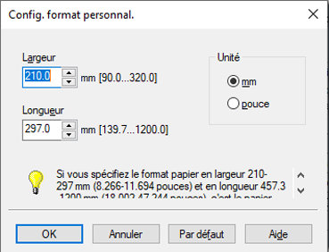 Lorsque vous utilisez le pilote PCL, vous pouvez enregistrer un format personnalisé dans [Enregistrer Formats perso...] de l'onglet [Réglages]. Le format papier enregistré peut être sélectionné dans [Format original] de l'onglet [De base]. Pour des détails, voir [Opérations disponibles dans l'onglet Paramètres] .