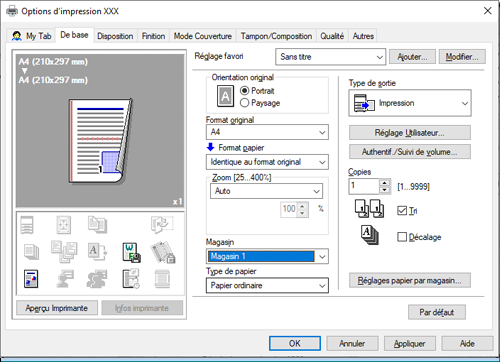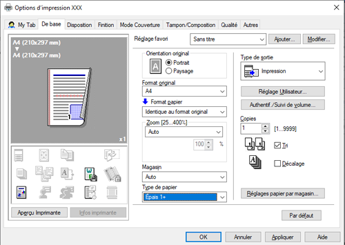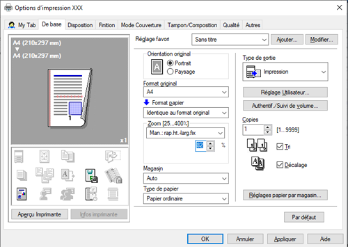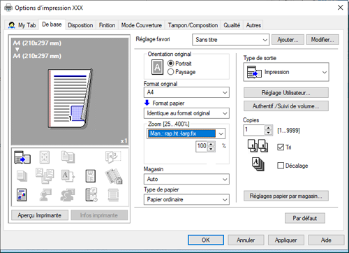 Dans [Format papier] dans l'onglet [De base], sélectionnez le format de papier pour l'impression. Le taux zoom est automatiquement déterminé par les formats de papier sélectionnés dans [Format original] et [Format papier].