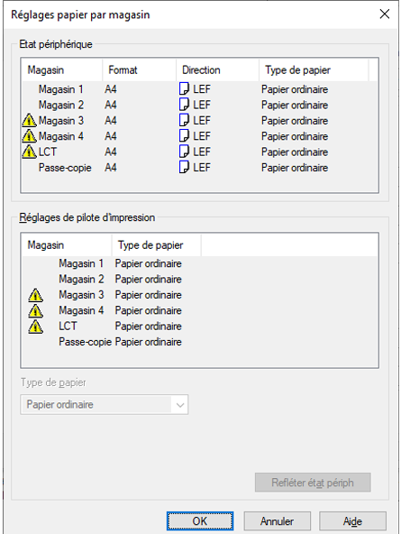 Lorsque [Réglages papier par magasin] est activé dans l'onglet [Paramètres] du pilote d'imprimante, sélectionnez [Réglages papier par magasin...] dans l'onglet [De base], puis spécifiez le type de papier pour chaque magasin.