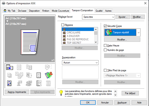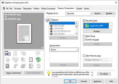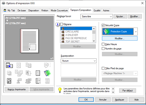 Sous l'onglet [Tampon/Surimpression], cochez la case [Sécurité Copie] et sélectionnez [Protection Copie].