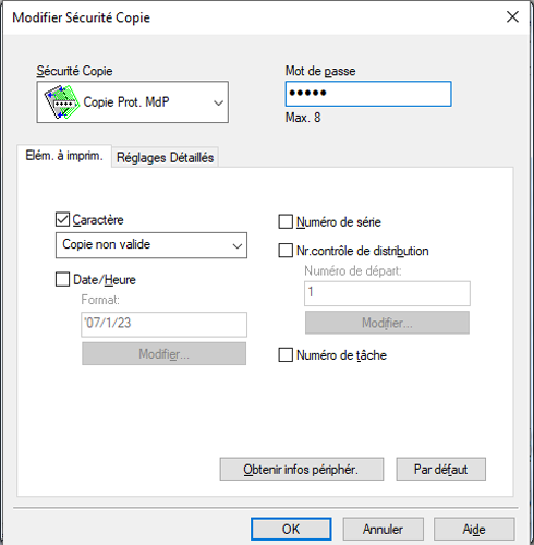 Les éléments qui ne peuvent pas être spécifiés varient selon la fonction Sécurité Copie sélectionnée.