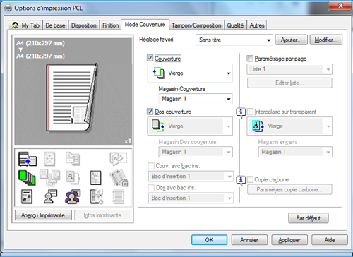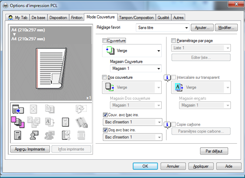 Dans [Magasin Couverture] ou [Magasin Dos couverture], sélectionnez le magasin papier correspondant au papier à utiliser pour la face ou le dos de couverture.