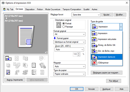 Dans [Type de sortie] dans l'onglet [De base], sélectionnez [Impression épreuve].