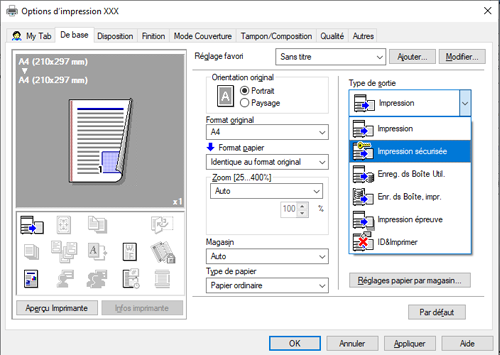 Dans [Méthode de sortie] de l'onglet [De base], sélectionnez [Impression sécurisée].