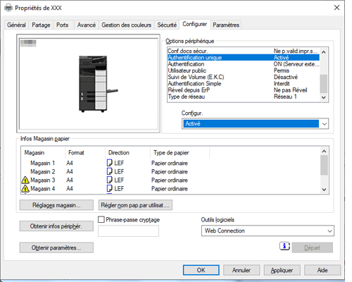 Dans l'onglet [Configurer] du pilote d'imprimante, vérifiez que les paramètres d'authentification utilisateur et d'authentification unique sont correctement configurés.
