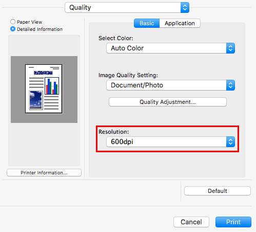 Sous [Resolution:] de l'onglet [Quality], sélectionnez la résolution pour imprimer un document.