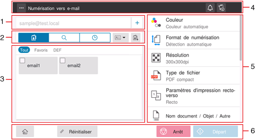 Si vous appuyez sur [Numériser vers e-mail] sur l'écran d'accueil, l'écran principal de Numériser vers e-mail s'affiche.