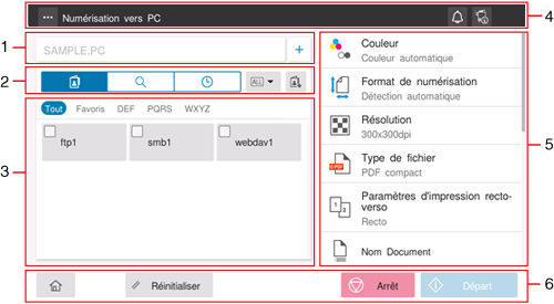 Si vous appuyez sur [Numériser vers PC] sur la page d'accueil, l'écran principal d'envoi sur PC (SMB/FTP/WebDAV) s'affiche.