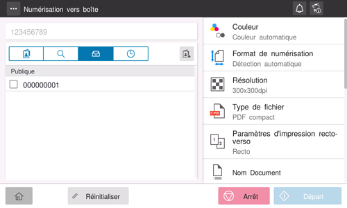 Le fait d'appuyer sur l'onglet Boîte () affiche la liste des boîtes utilisateur enregistrées sur cette machine. Changez le type de boîtes utilisateur affichées dans la liste à l'aide de la clé de filtre du menu déroulant et spécifiez la boîte utilisateur cible.