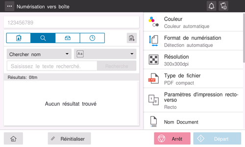 Le fait d'appuyer sur l'onglet Recherche () affiche l'écran Rechercher boîte. Si un grand nombre de boîtes utilisateur sont enregistrées, le système recherche le nom enregistré ou le numéro de la boîte utilisateur cible pour spécifier la destination cible.