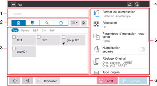 Si vous appuyez sur [Fax] sur l'écran d'accueil, l'écran principal de Fax s'affiche.