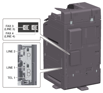 L'illustration représente une unité dotée du kit Fax FK-514, du kit Fax FK-515 et du kit de montage Fax MK-742 en option. FAX3 (port LINE 3) et FAX4 (port LINE 4) peuvent s'utiliser sur des modèles destinés à l'Amérique du Nord et à Hong Kong parce que ces modèles sont compatibles avec le kit fax FK-515 et le kit de montage fax MK-742.
