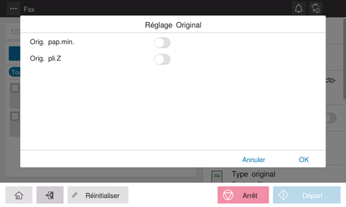 [Original Plié en Z] | Si un original plié est chargé dans le Chargeur ADF, il se peut que le format de l'original ne puisse pas être détecté de manière exacte. Pour numériser un original plié dans le chargeur ADF, activez cette option. |