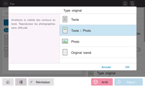 Sélectionnez les réglages optimaux pour numériser l'original dans une qualité d'image optimale.