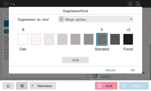Il est possible de régler la densité de l'arrière-plan pour les originaux qui présentent un fond coloré (journaux, papier recyclé, etc.) ou les originaux qui sont trop fins pour que leur recto ne transparaissent pas lors de la numérisation.