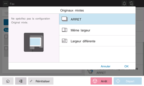 Même pour un original avec des pages de formats différents, le Chargeur ADF vous permet de numériser les données tout en détectant le format de chaque page. Si les largeurs des originaux sont identiques, sélectionnez [Même largeur]. Si les largeurs des originaux ne sont pas identiques, sélectionnez [Largeur différente].